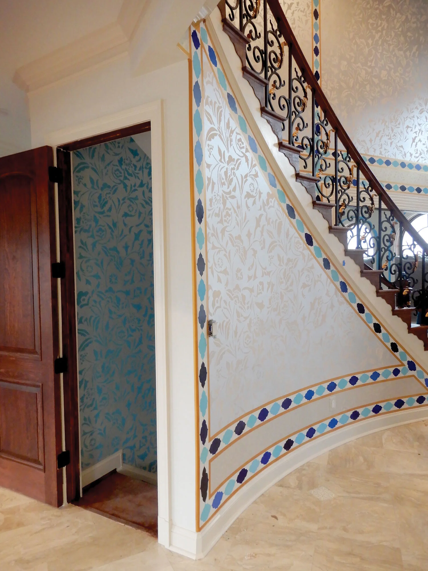 The basement stairway is painted in the reverse of the Foyer. It is the same pattern but painted in blue. The lower level room it services is painted with the same stencil but is tan on gold.